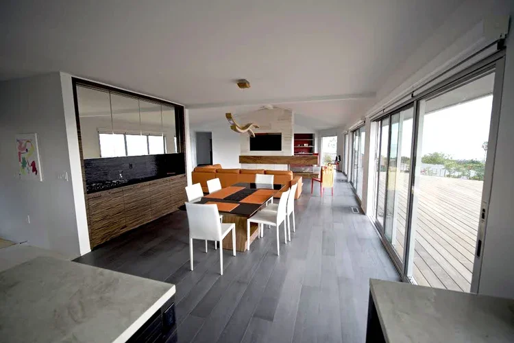 For this elegant seaside residence De Angelis Design creation blends contemporary design with the tranquility of coastal living. Perched near the ocean, the open-plan interior is flooded with natural light thanks to expansive sliding glass doors that offer uninterrupted views of the surrounding seascape. The layout flows effortlessly from kitchen to dining to living area, echoing the openness of the nearby shore. Warm wood tones and marine-inspired color accents—like the vivid orange cabinetry and furnishings—add vibrancy and character, while the sleek finishes reflect the clarity of the coastal light. Ideal for relaxed entertaining or serene everyday living, this home captures the essence of refined life by the sea.