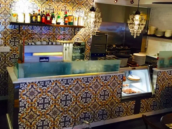 This vibrant and inviting space combines Mediterranean charm with urban sophistication. The standout feature is the richly patterned tilework that wraps the bar and back wall, creating an eye-catching focal point filled with warmth and cultural texture. Crystal chandeliers add a touch of elegance and contrast beautifully with the industrial elements like exposed brick and stainless steel. Frosted glass panels subtly divide the prep areas while maintaining openness and flow. The design merges functionality and flair, making the space feel both refined and welcoming—perfect for a lively café or intimate bistro experience.